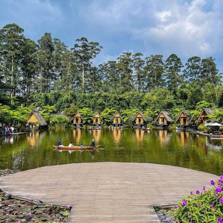 Daya tarik utamanya ada pada danau cantik dengan restoran bertema saung bambu (Purbasari) di tepinya. Ambience-nya tenang banget, cocok buat kamu yang mau slow living sejenak. Saat malam hari, suasananya berubah jadi romantis dan magical berkat lampu-lampu taman yang estetik.